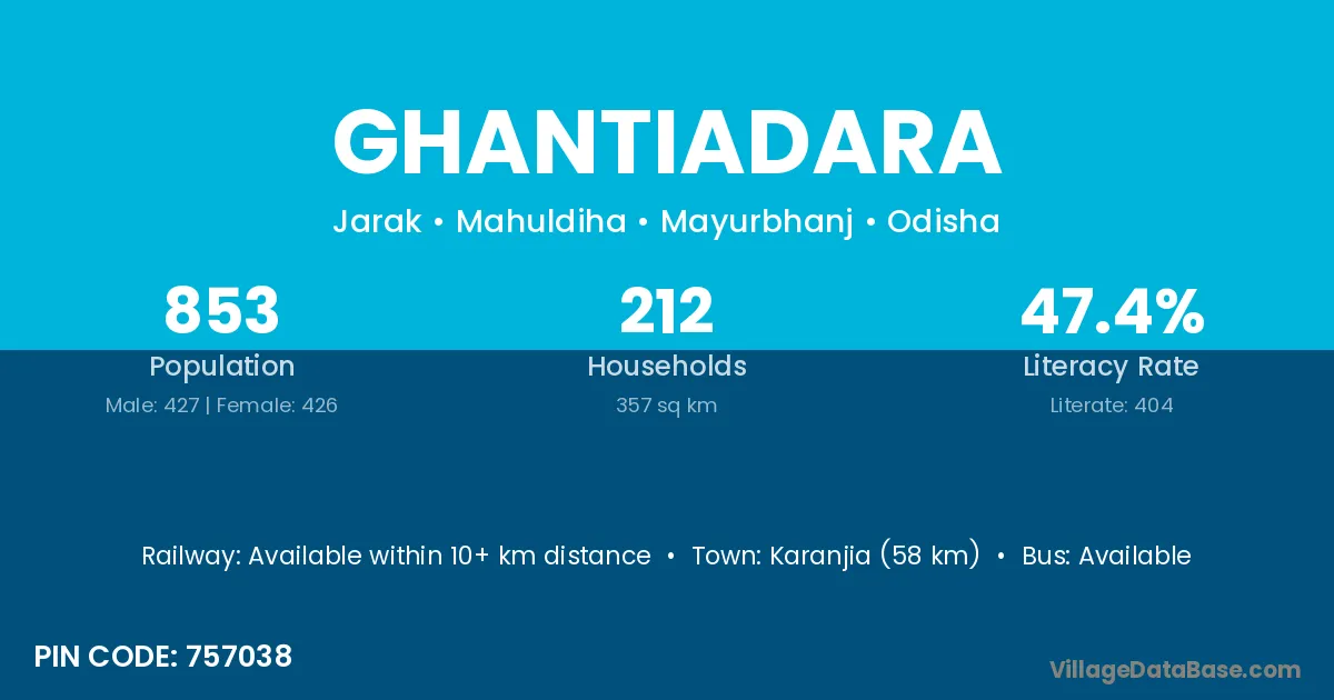 Karanjia (58 km) is the nearest town to Ghantiadara village for major economic activities and is located approximately 58 km away.