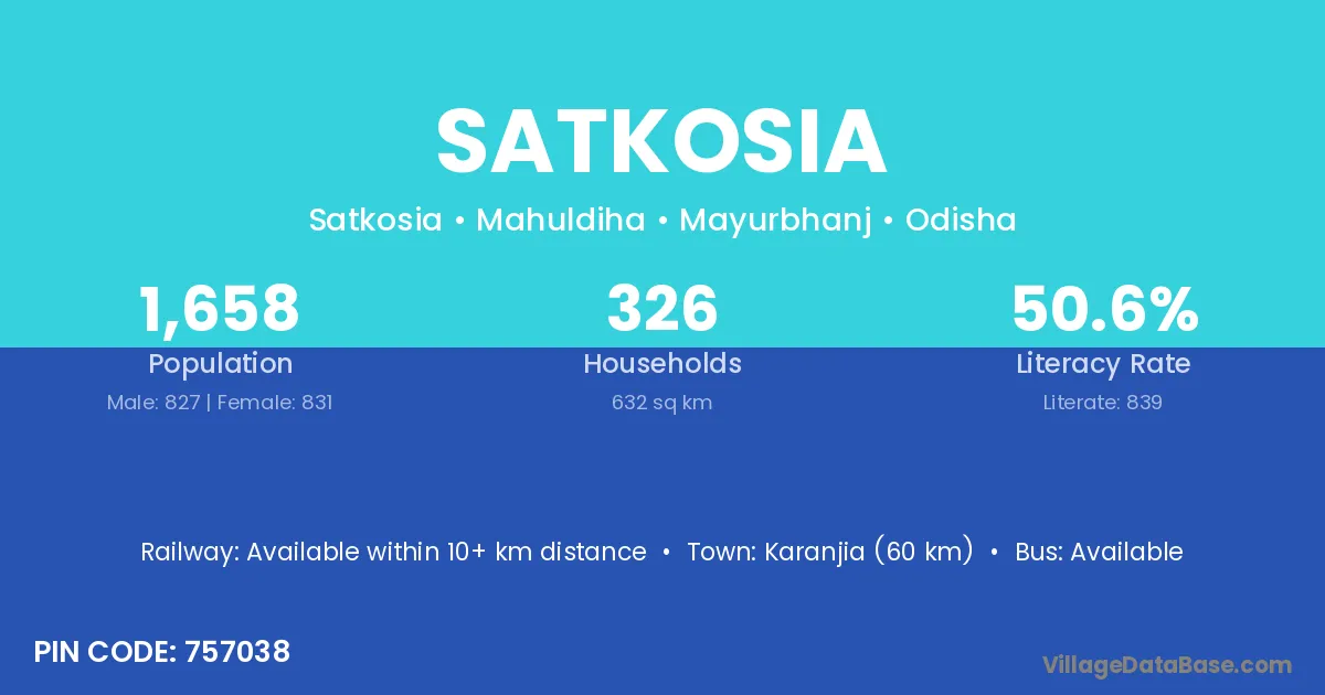 Karanjia (60 km) is the nearest town to Satkosia village for major economic activities and is located approximately 60 km away.