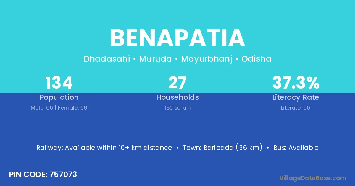 Baripada (36 km) is the nearest town to Benapatia village for major economic activities and is located approximately 36 km away.