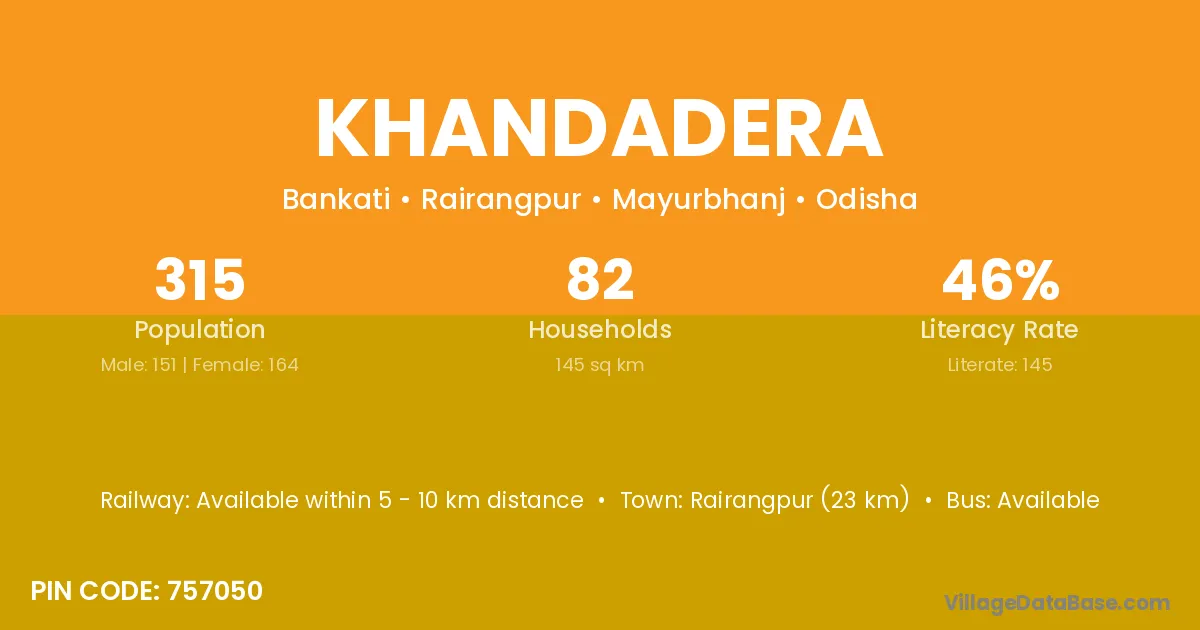 Rairangpur (23 km) is the nearest town to Khandadera village for major economic activities and is located approximately 23 km away.