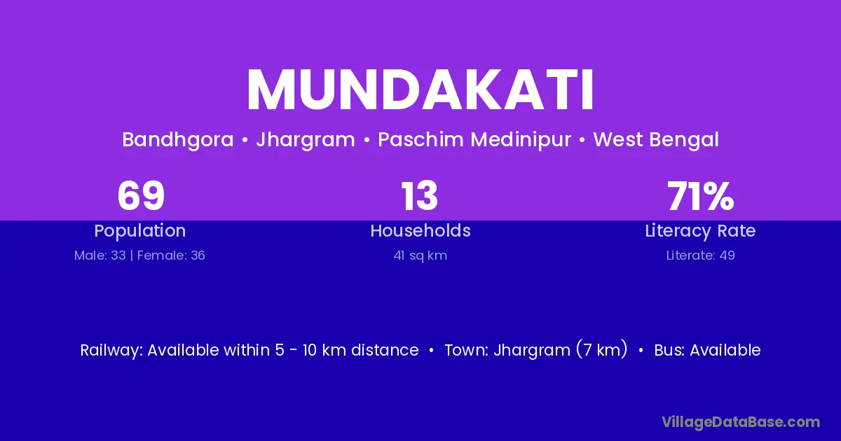 Rairangpur (11 km) is the nearest town to Mundakati village for major economic activities and is located approximately 11 km away.