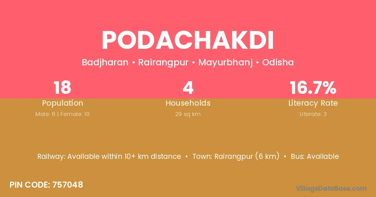 Rairangpur (6 km) is the nearest town to Podachakdi village for major economic activities and is located approximately 6 km away.
