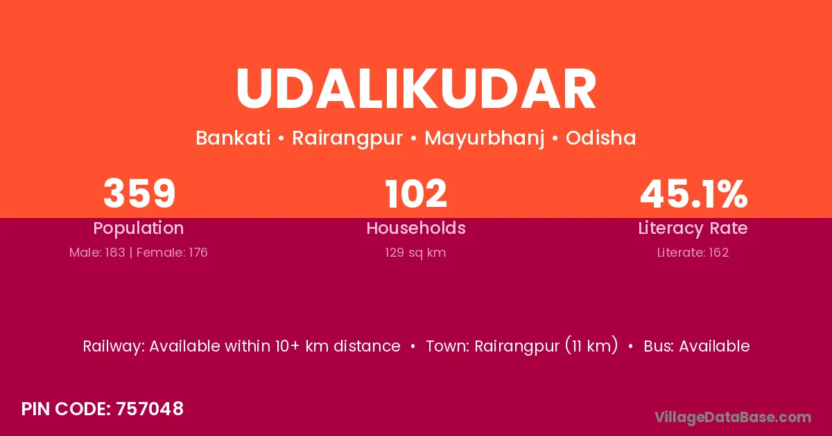 Rairangpur (11 km) is the nearest town to Udalikudar village for major economic activities and is located approximately 11 km away.