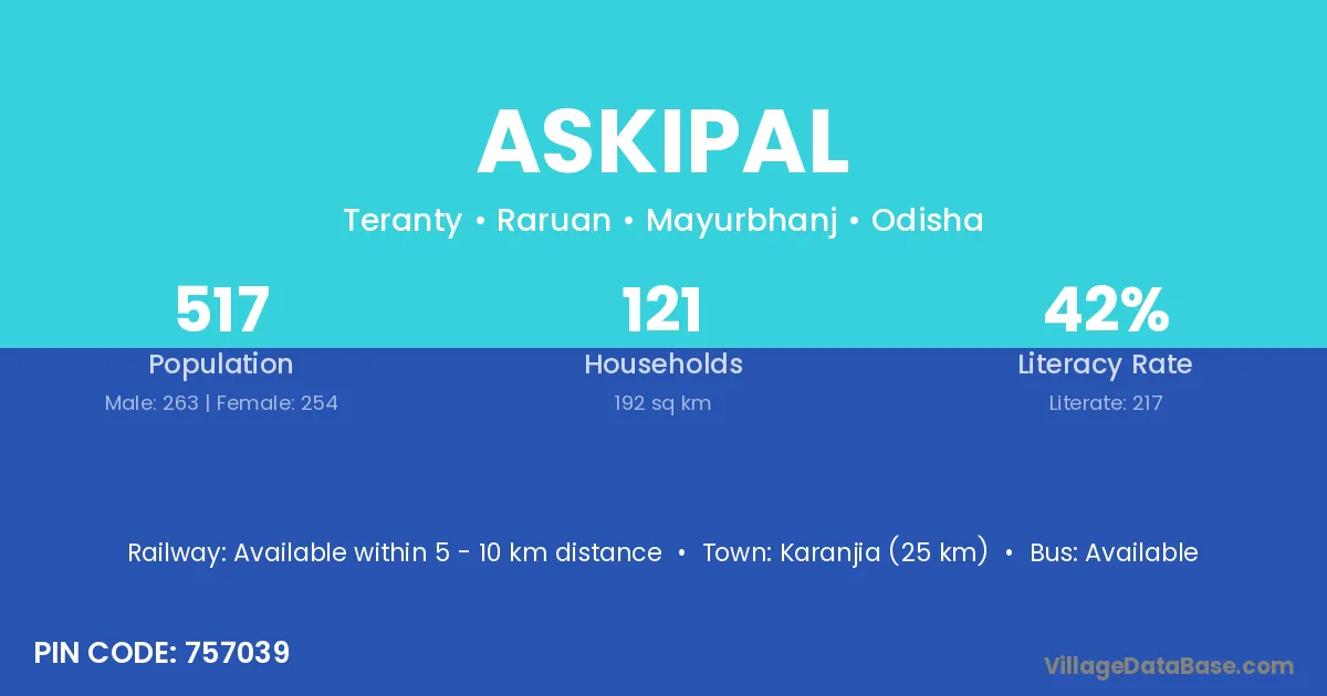 Karanjia (25 km) is the nearest town to Askipal village for major economic activities and is located approximately 25 km away.