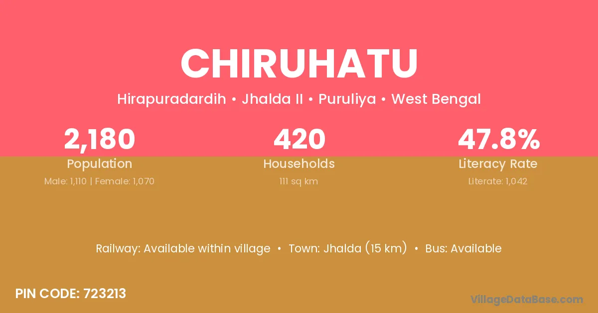 The literacy rate of Chiruhatu village is 50.90%. Male literacy stands at 57.89% and female literacy at 44.52%.