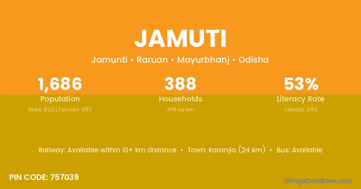 Karanjia (24 km) is the nearest town to Jamuti village for major economic activities and is located approximately 24 km away.