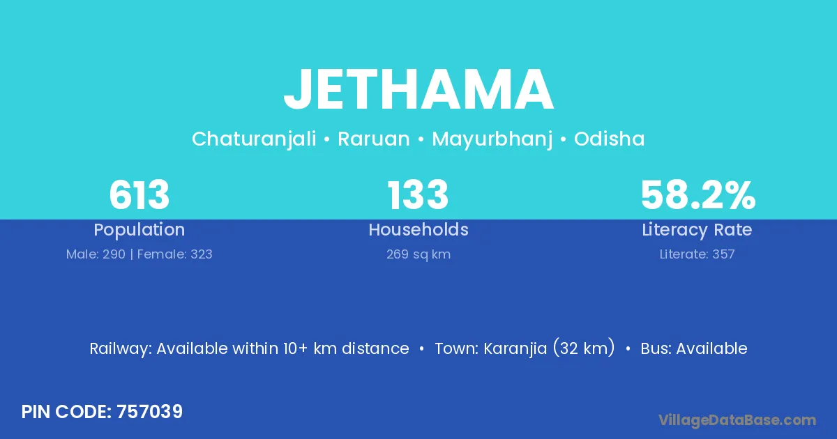 Karanjia (32 km) is the nearest town to Jethama village for major economic activities and is located approximately 32 km away.
