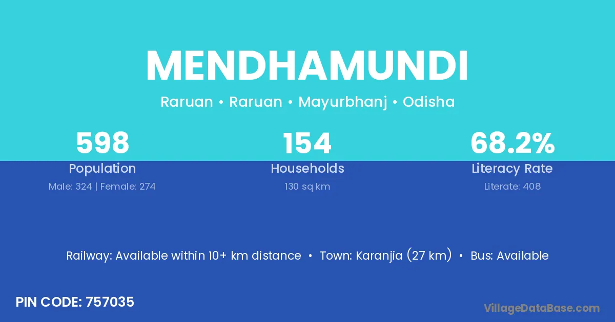 Karanjia (27 km) is the nearest town to Mendhamundi village for major economic activities and is located approximately 27 km away.