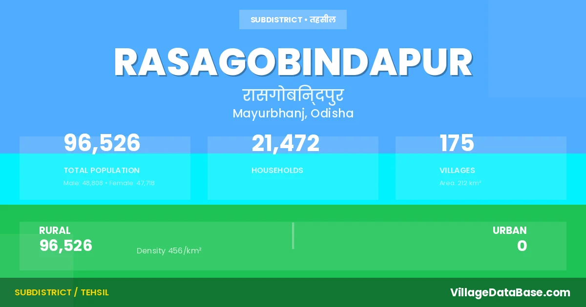 According to the 2011 census The total area of Rasagobindapur Tehsil is 212 km², with a population of 96526 people. The population density is 456 inhabitants per square kilometre, and there are approximately 21472 houses in the sub district.
