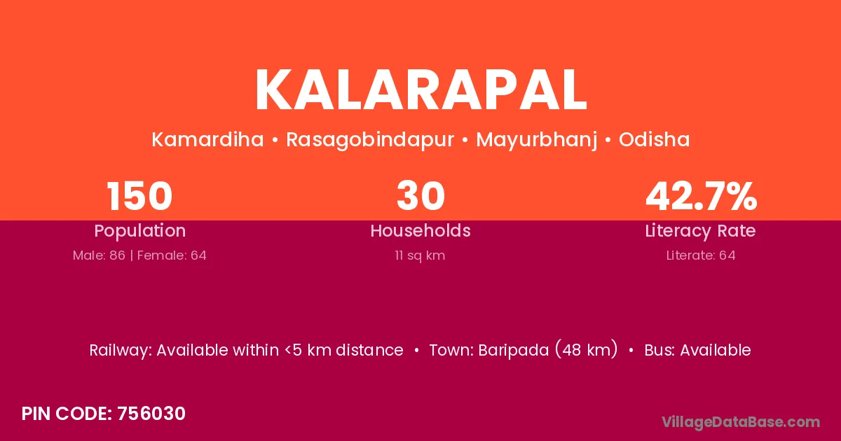 Baripada (48 km) is the nearest town to Kalarapal village for major economic activities and is located approximately 48 km away.