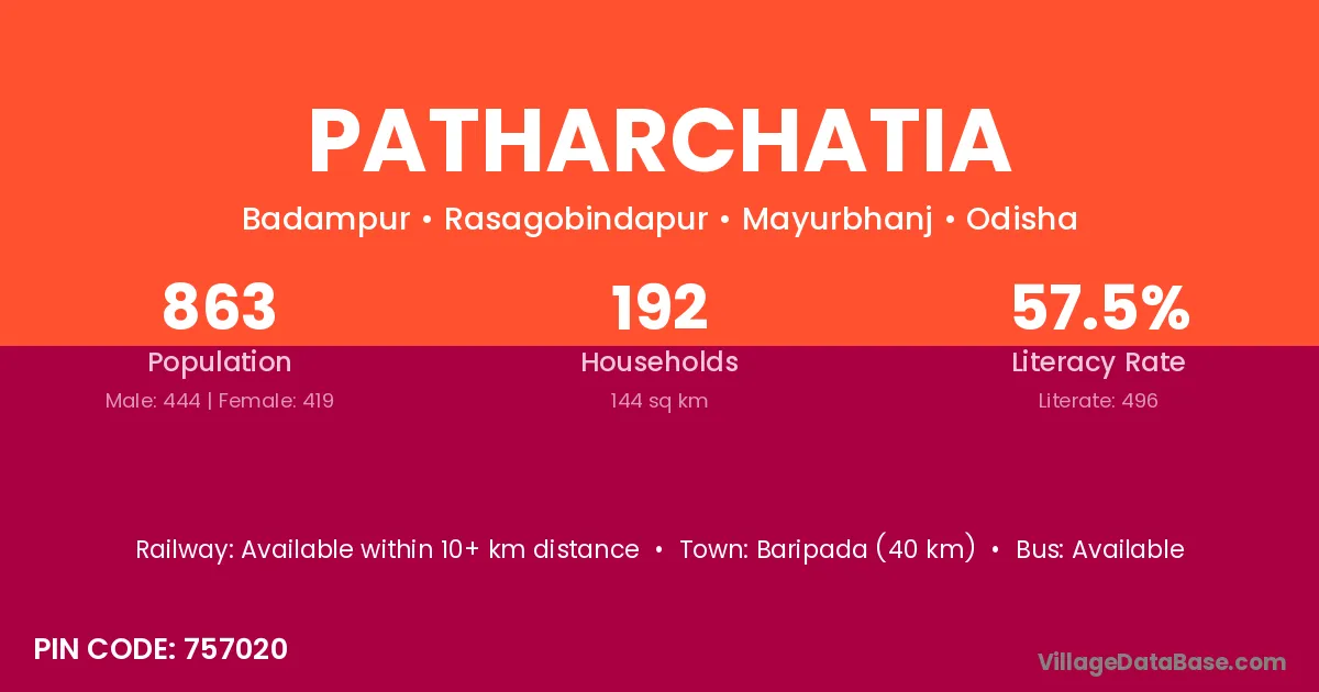 Baripada (40 km) is the nearest town to Patharchatia village for major economic activities and is located approximately 40 km away.