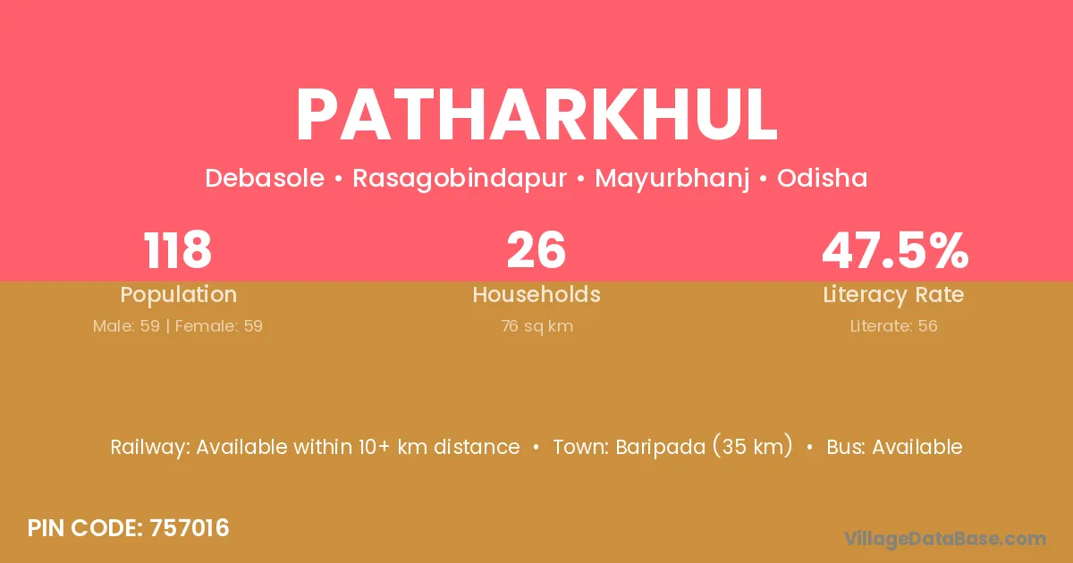 Baripada (35 km) is the nearest town to Patharkhul village for major economic activities and is located approximately 35 km away.