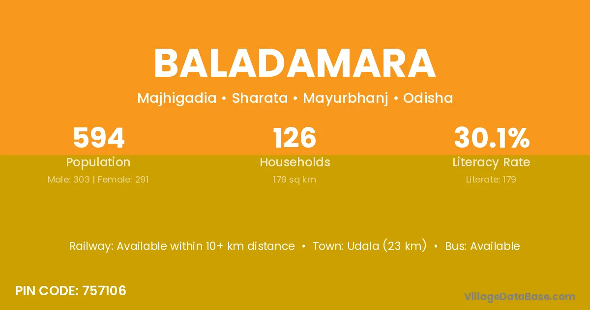 Udala (23 km) is the nearest town to Baladamara village for major economic activities and is located approximately 23 km away.