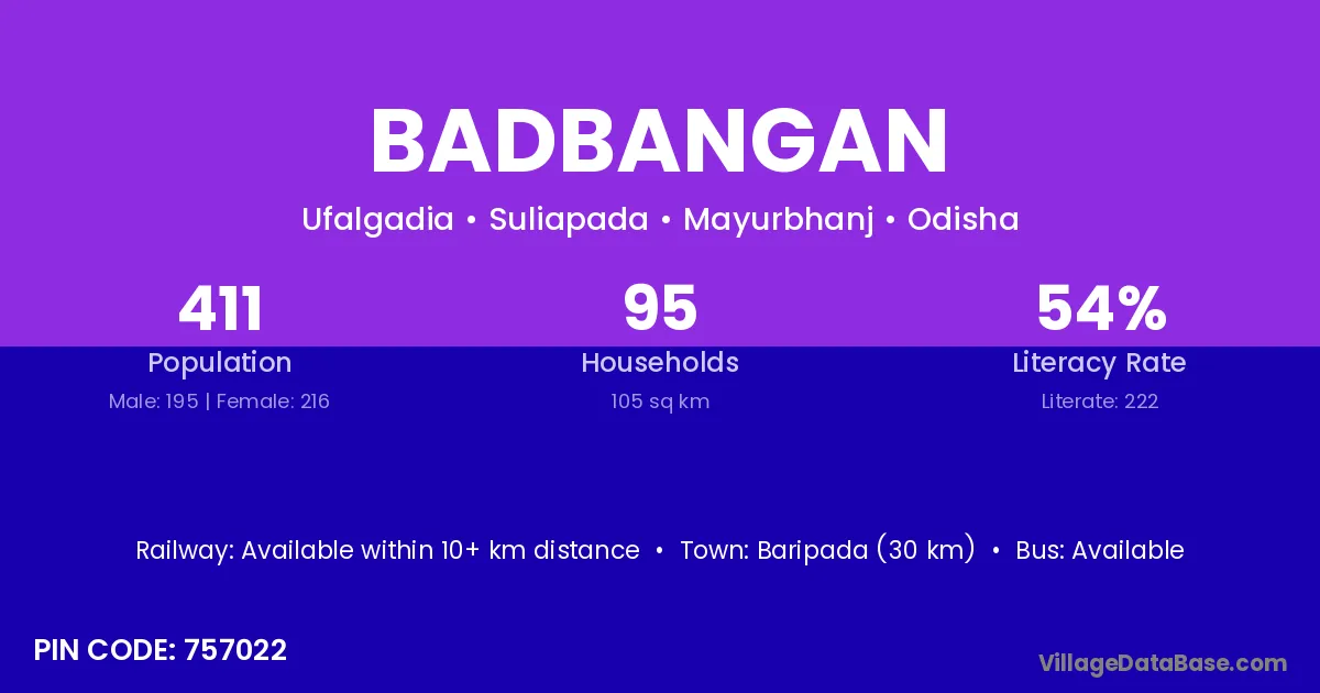 Baripada (30 km) is the nearest town to Badbangan village for major economic activities and is located approximately 30 km away.