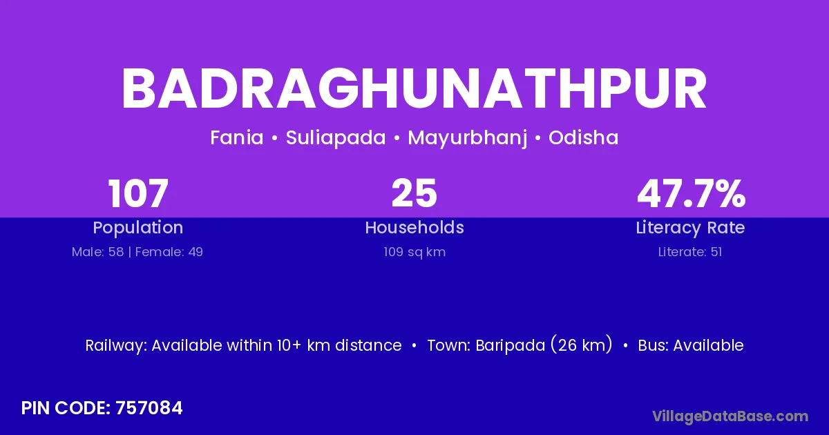 Badraghunathpur village has a total population of 107 people, of which 58 are males and 49 are females.