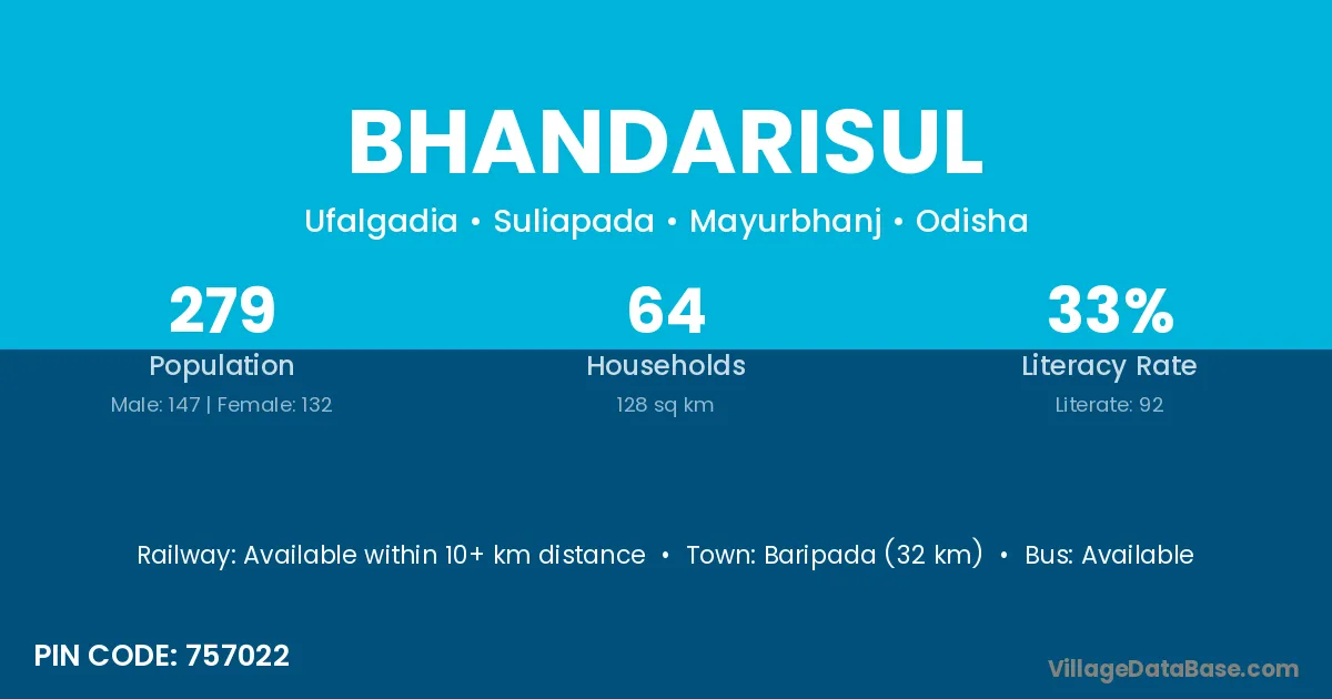 Baripada (32 km) is the nearest town to Bhandarisul village for major economic activities and is located approximately 32 km away.