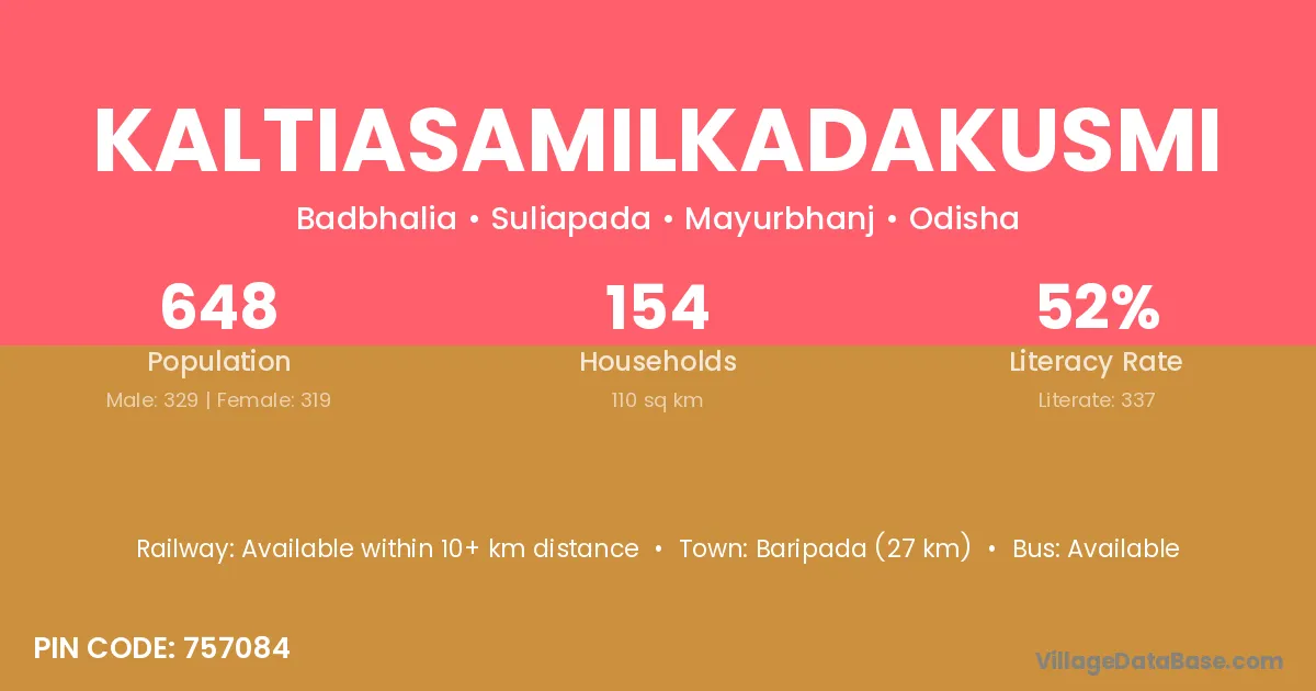 Kaltiasamilkadakusmi village has a total population of 648 people, of which 329 are males and 319 are females.