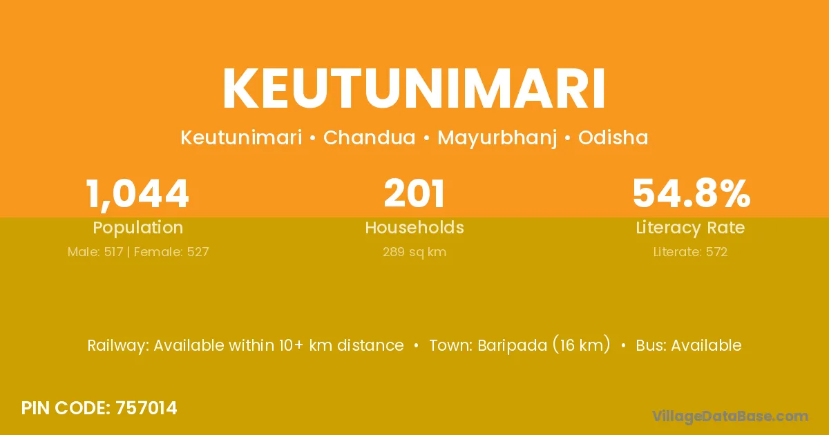 Baripada (22 km) is the nearest town to Keutunimari village for major economic activities and is located approximately 22 km away.
