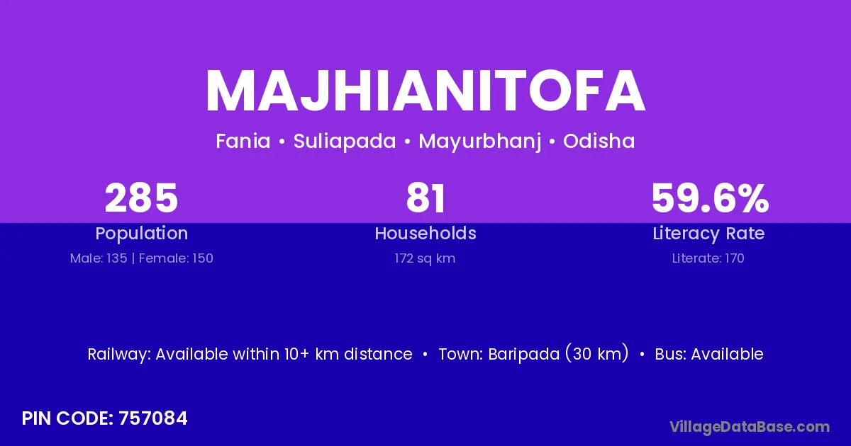 Baripada (30 km) is the nearest town to Majhianitofa village for major economic activities and is located approximately 30 km away.