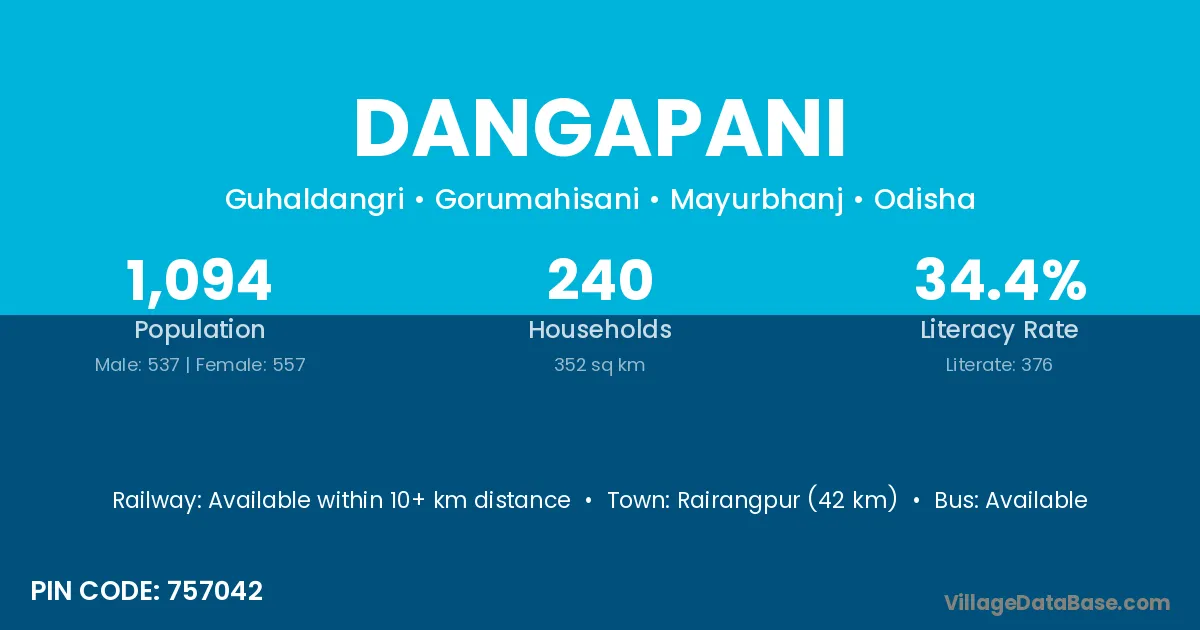 Karanjia (38 km) is the nearest town to Dangapani village for major economic activities and is located approximately 38 km away.