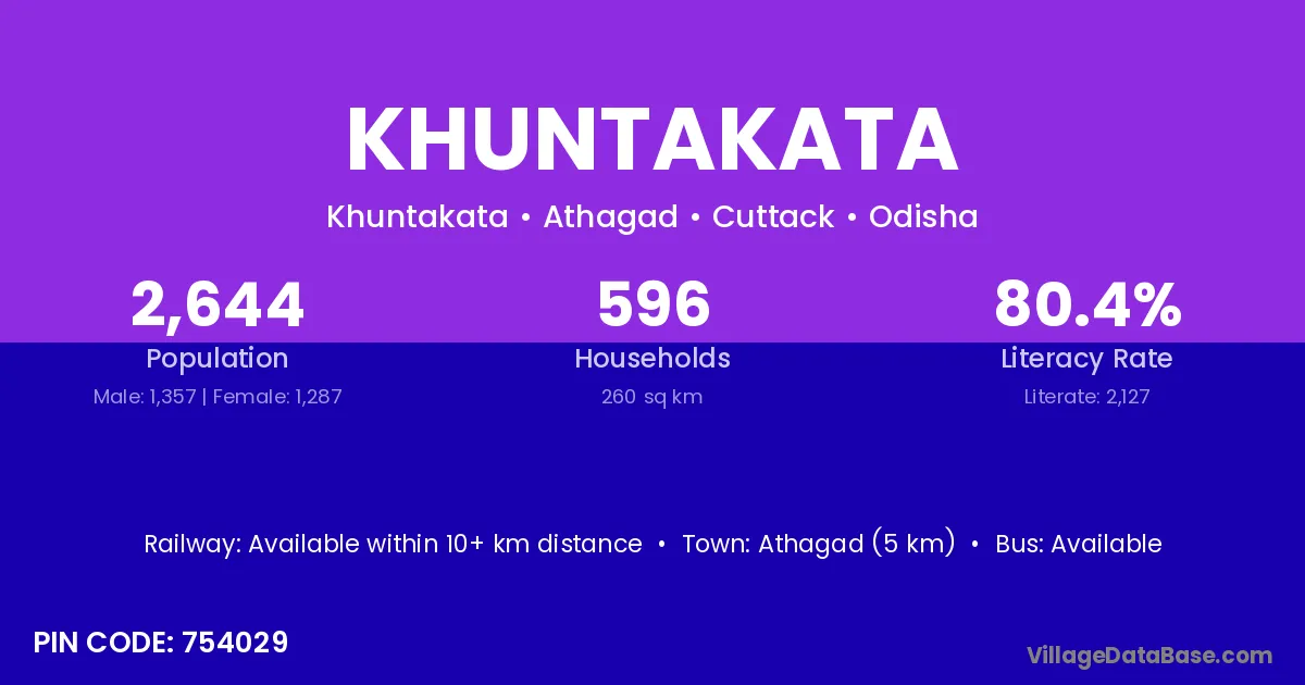 Karanjia (27 km) is the nearest town to Khuntakata village for major economic activities and is located approximately 27 km away.