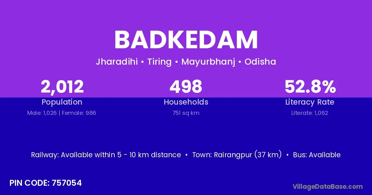 Rairangpur (37 km) is the nearest town to Badkedam village for major economic activities and is located approximately 37 km away.