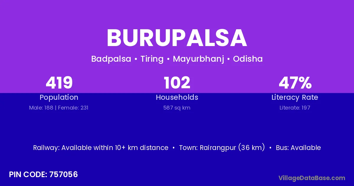 Rairangpur (36 km) is the nearest town to Burupalsa village for major economic activities and is located approximately 36 km away.
