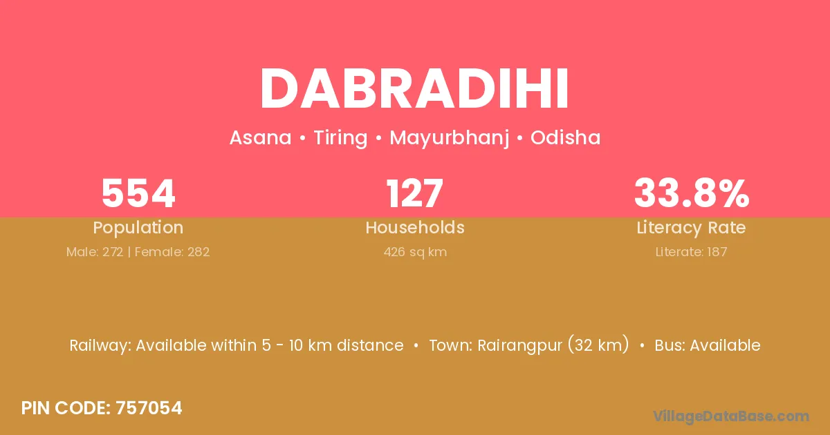 Rairangpur (32 km) is the nearest town to Dabradihi village for major economic activities and is located approximately 32 km away.