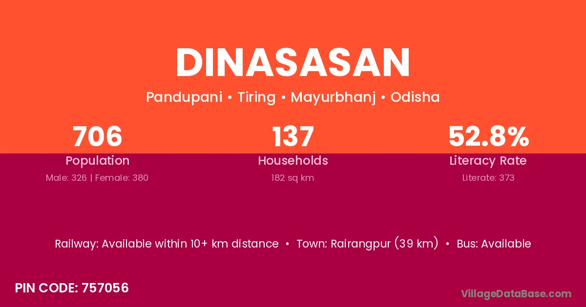 Rairangpur (39 km) is the nearest town to Dinasasan village for major economic activities and is located approximately 39 km away.