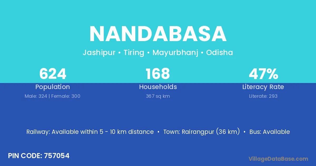 Rairangpur (36 km) is the nearest town to Nandabasa village for major economic activities and is located approximately 36 km away.