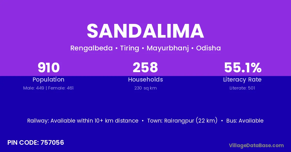 Rairangpur (22 km) is the nearest town to Sandalima village for major economic activities and is located approximately 22 km away.