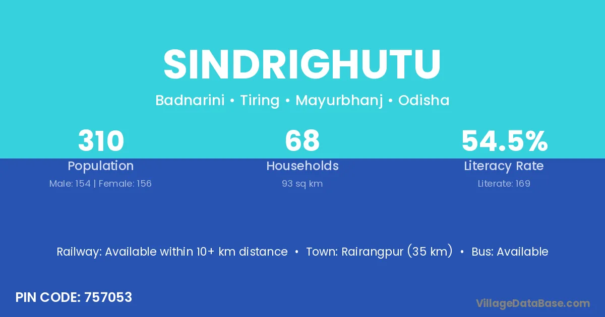 Rairangpur (35 km) is the nearest town to Sindrighutu village for major economic activities and is located approximately 35 km away.