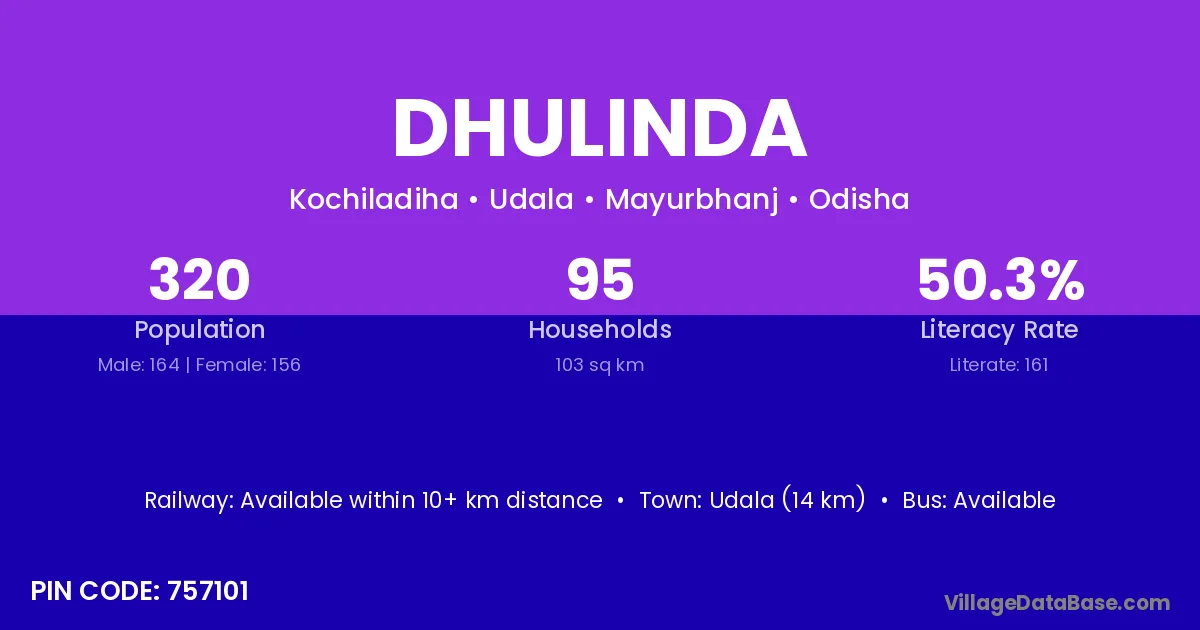 Udala (14 km) is the nearest town to Dhulinda village for major economic activities and is located approximately 14 km away.