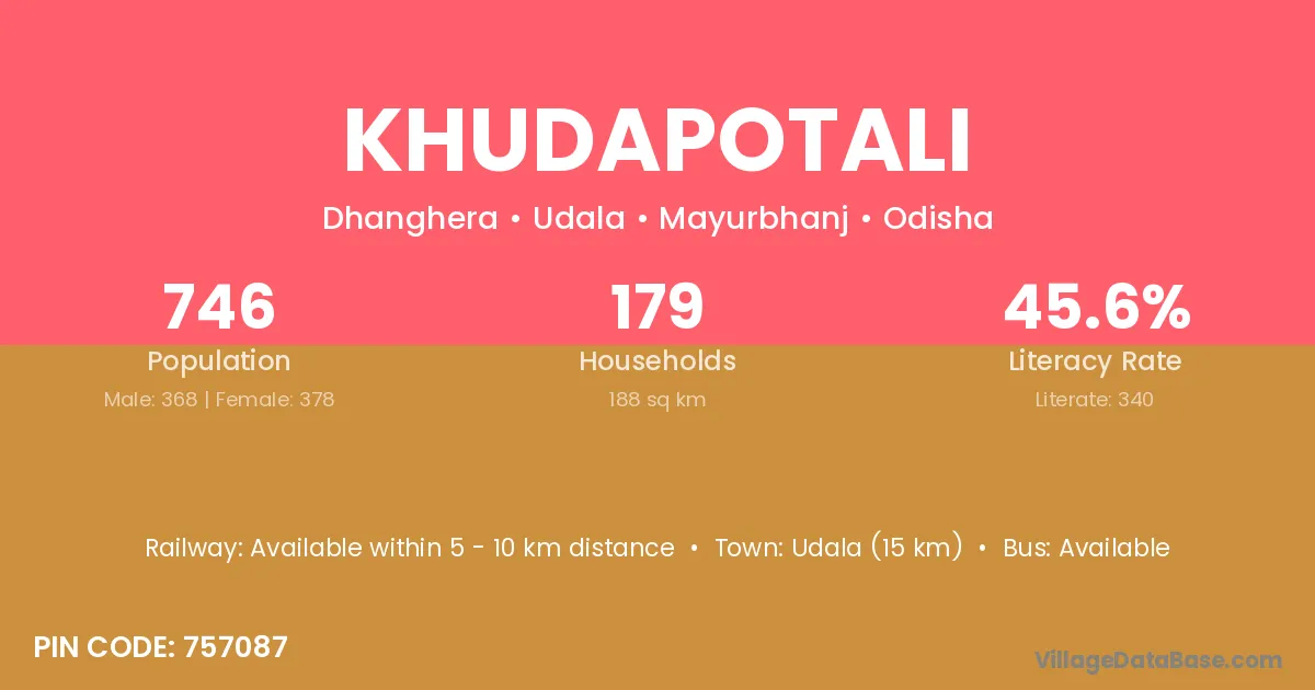 Khudapotali village has a total population of 746 people, of which 368 are males and 378 are females.
