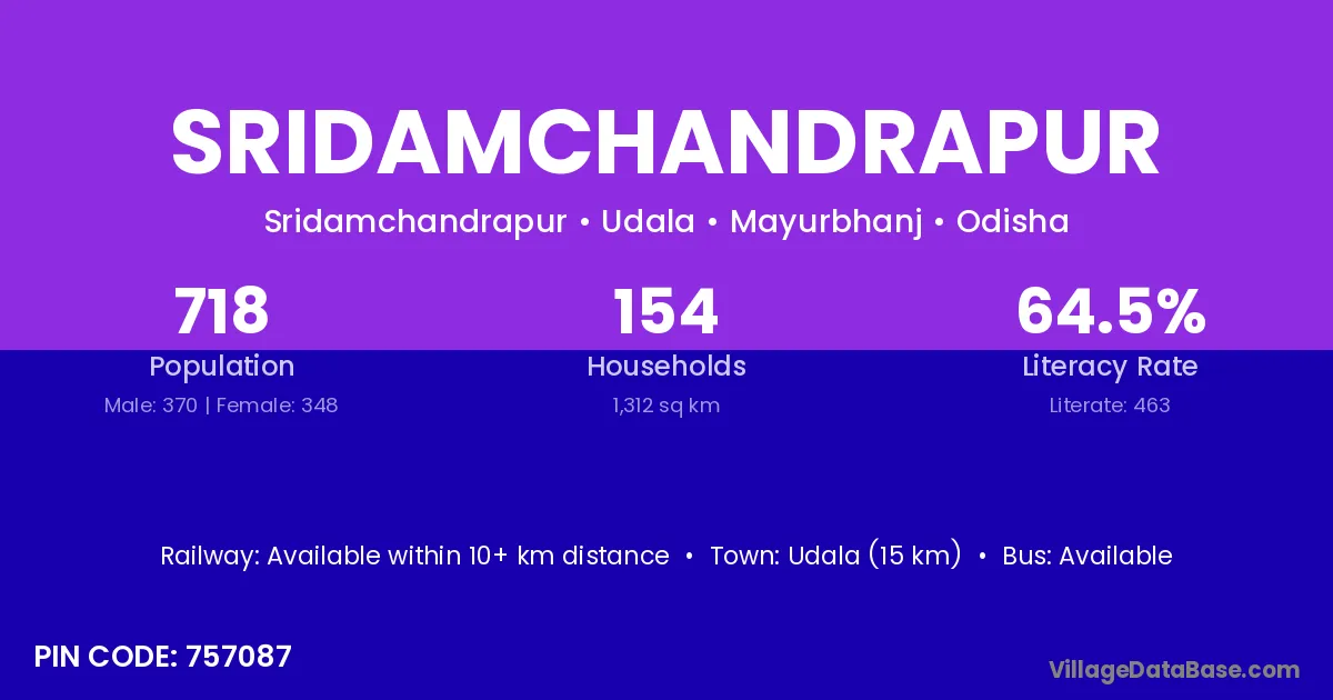 Udala (15 km) is the nearest town to Sridamchandrapur village for major economic activities and is located approximately 15 km away.