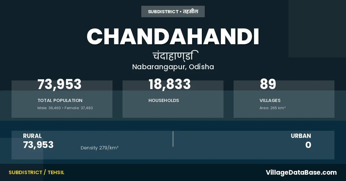 According to the 2011 census The total area of Chandahandi Tehsil is 265 km², with a population of 73953 people. The population density is 279 inhabitants per square kilometre, and there are approximately 18833 houses in the sub district.