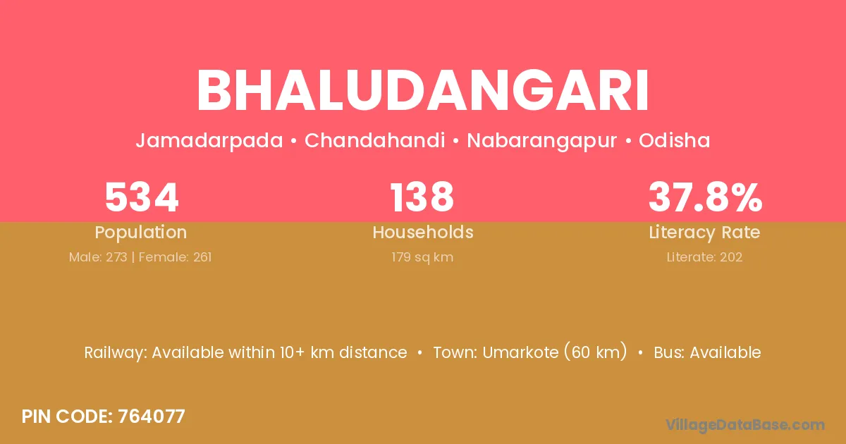 Umarkote (60 km) is the nearest town to Bhaludangari village for major economic activities and is located approximately 60 km away.