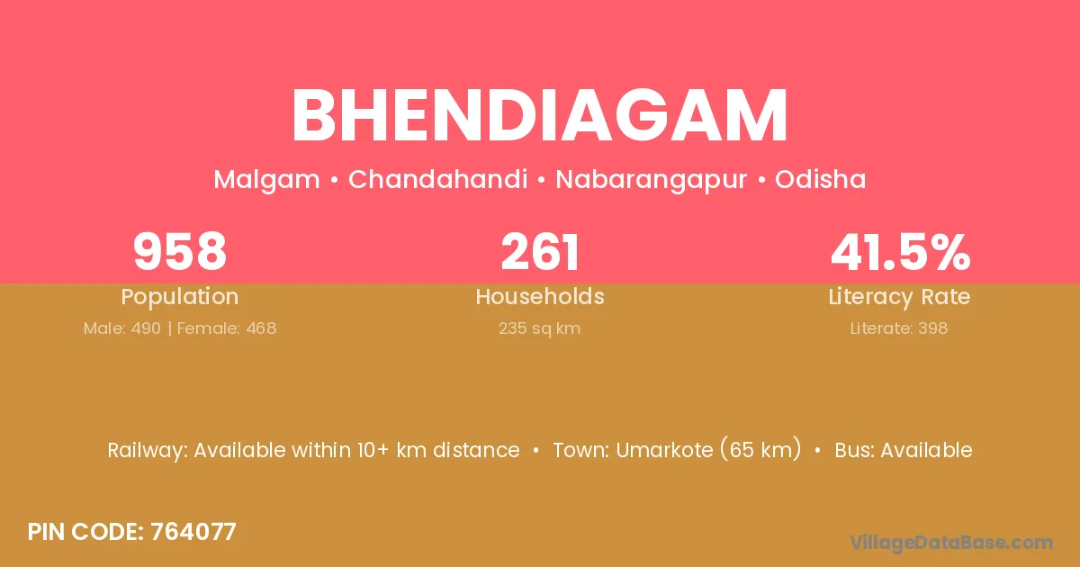 Umarkote (65 km) is the nearest town to Bhendiagam village for major economic activities and is located approximately 65 km away.