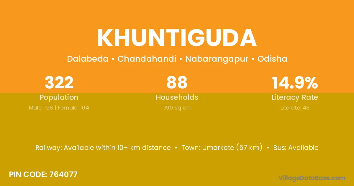 Umarkote (57 km) is the nearest town to Khuntiguda village for major economic activities and is located approximately 57 km away.