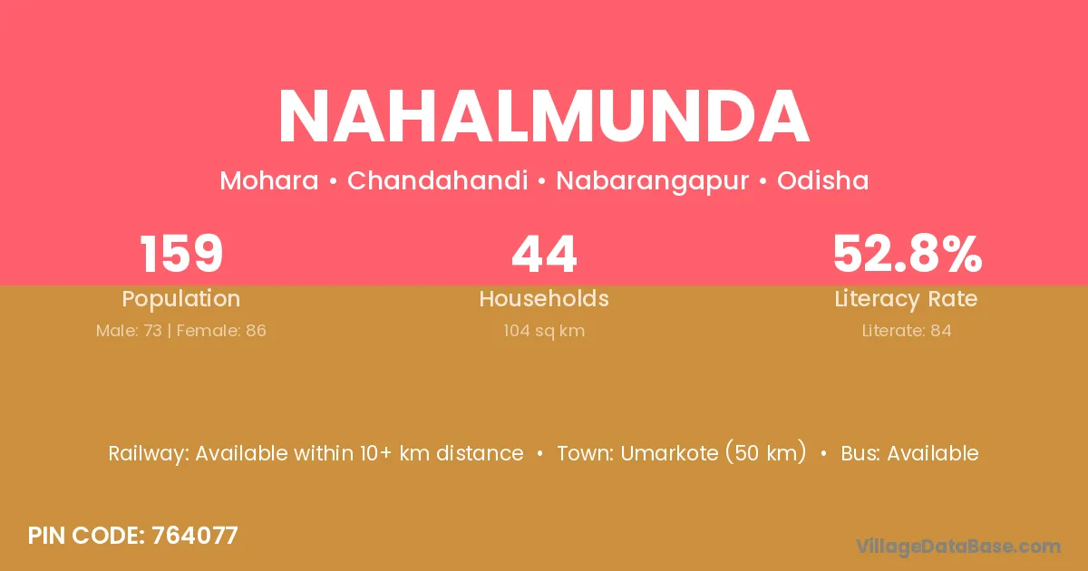 Umarkote (50 km) is the nearest town to Nahalmunda village for major economic activities and is located approximately 50 km away.