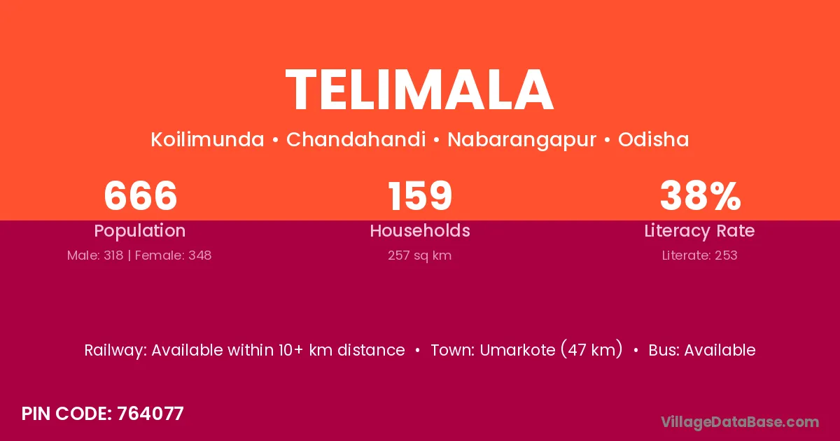 Umarkote (47 km) is the nearest town to Telimala village for major economic activities and is located approximately 47 km away.