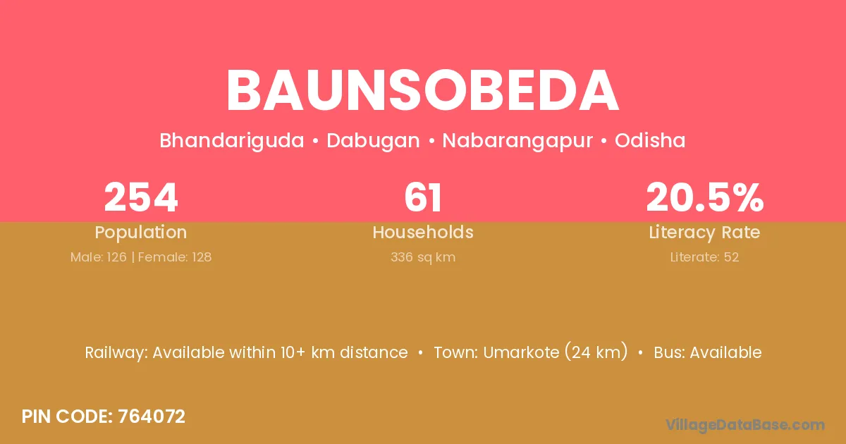 Baunsobeda village has a total population of 254 people, of which 126 are males and 128 are females.