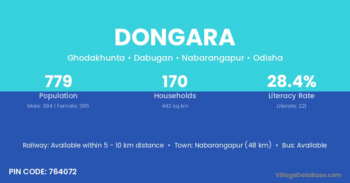 Nabarangapur (48 km) is the nearest town to Dongara village for major economic activities and is located approximately 48 km away.