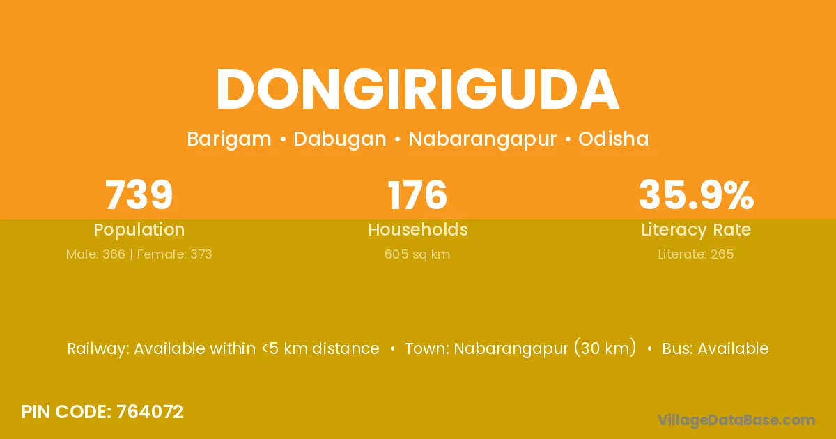 Nabarangapur (30 km) is the nearest town to Dongiriguda village for major economic activities and is located approximately 30 km away.