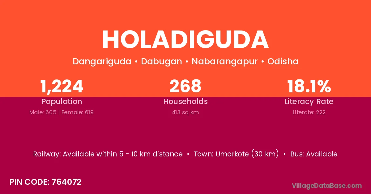 Umarkote (30 km) is the nearest town to Holadiguda village for major economic activities and is located approximately 30 km away.
