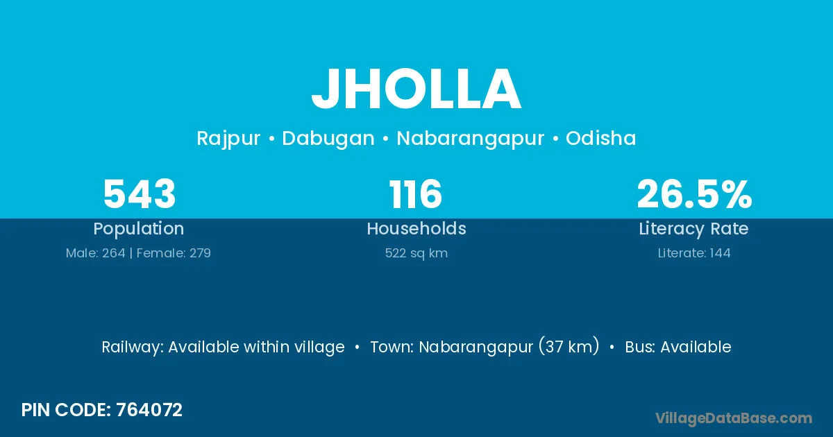 Nabarangapur (37 km) is the nearest town to Jholla village for major economic activities and is located approximately 37 km away.