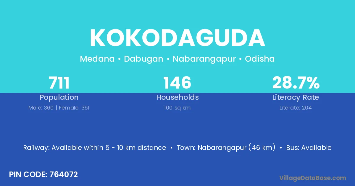 Nabarangapur (46 km) is the nearest town to Kokodaguda village for major economic activities and is located approximately 46 km away.