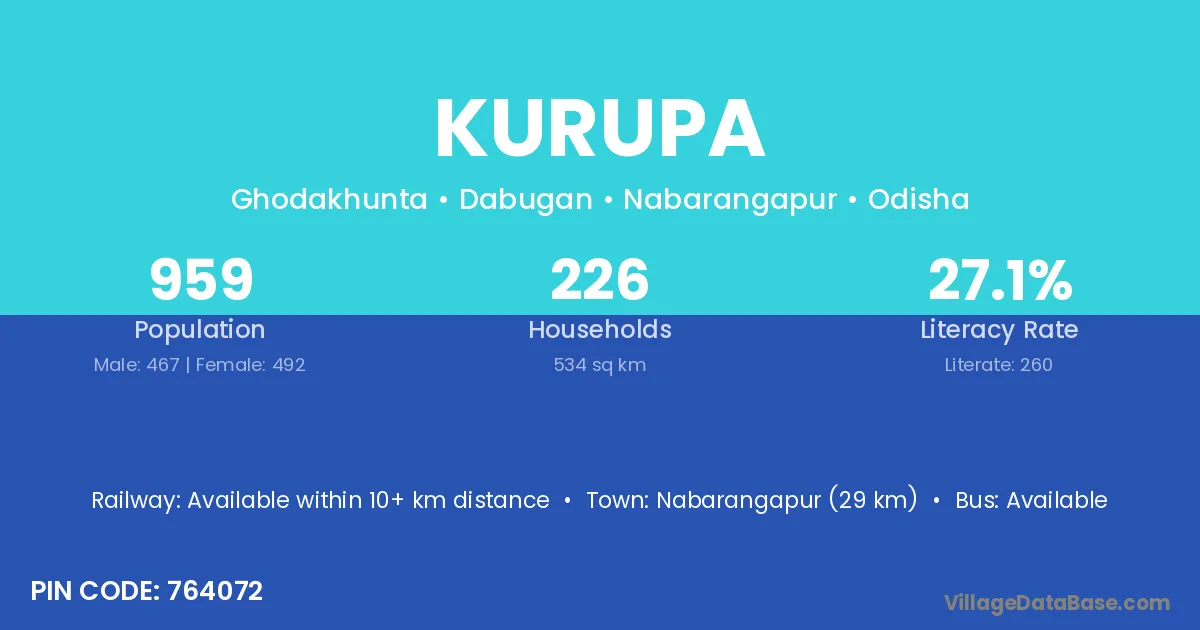 Nabarangapur (29 km) is the nearest town to Kurupa village for major economic activities and is located approximately 29 km away.