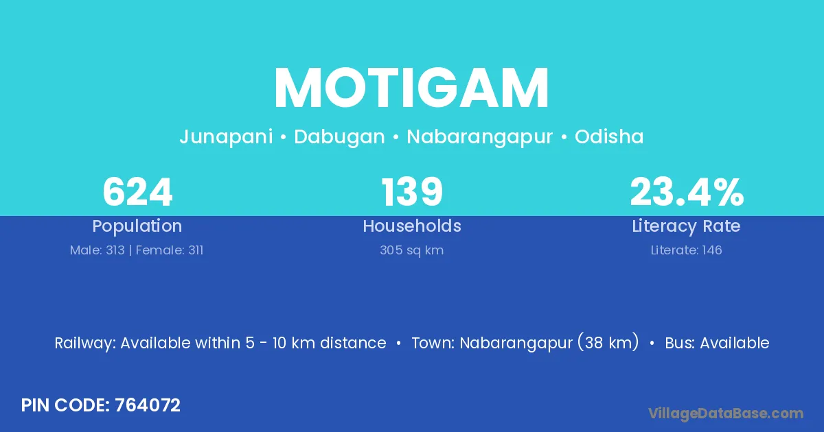 Nabarangapur (38 km) is the nearest town to Motigam village for major economic activities and is located approximately 38 km away.