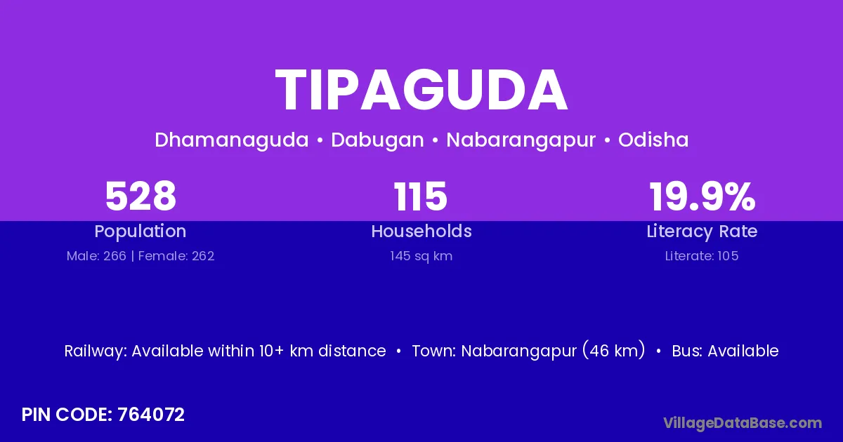 Nabarangapur (46 km) is the nearest town to Tipaguda village for major economic activities and is located approximately 46 km away.